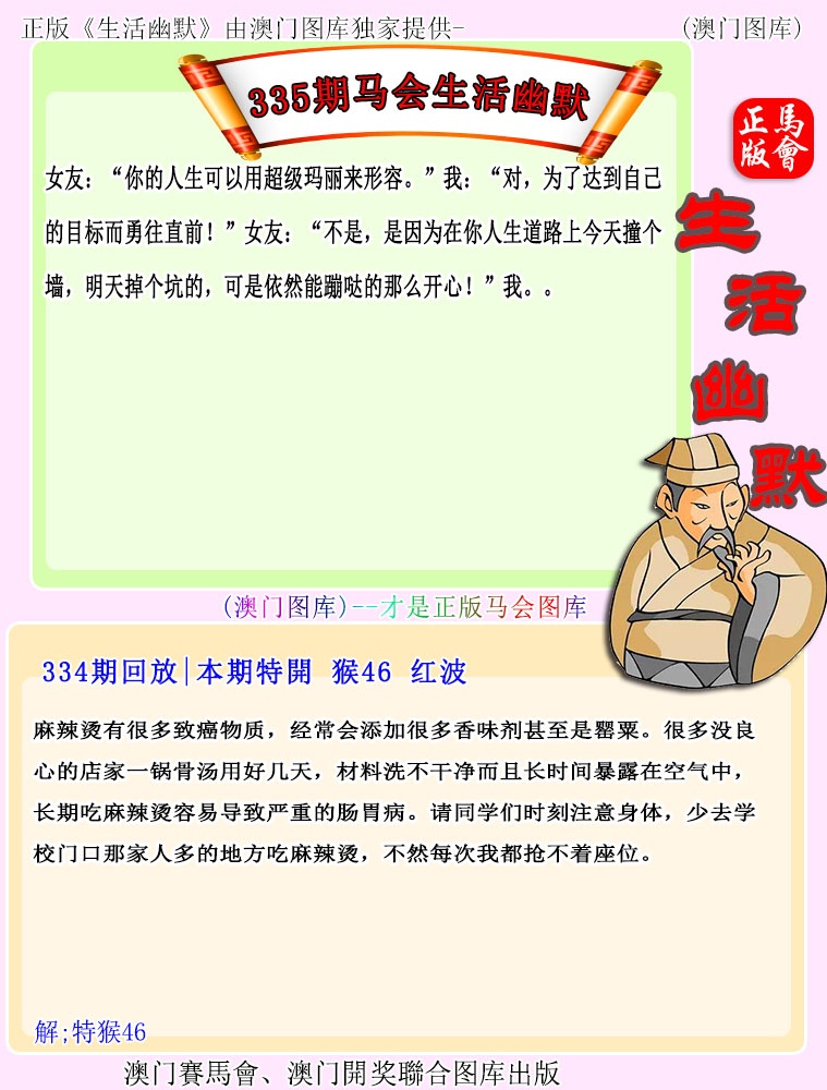 | 335期:内幕①肖+三中三开:狗44准 内幕①肖:【狗】 三中三:【13-46-31】 |